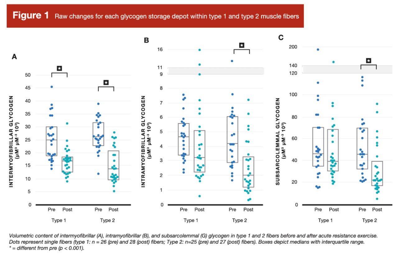 In type 1 fibers, intermyofibrillar glycogen significantly decreased by 33%. Yet type 2 fibers (fast-twitch + heavy resistance training rep ranges) showed significant reductions across all three depots: intermyofibrillar by 48%, intramyofibrillar by 54%, & subsarcolemmal by 47%. Notably, 48% of type 2 fibers also exhibited extreme intramyofibrillar depletion, which was rare in type 1 fibers.