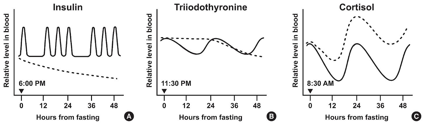 First, we are evolutionarily hardwired to detect a prolonged energy deficit as a metabolic stressor that triggers the hypothalamic-pituitary-adrenal (HPA) axis to release cortisol. Blood glucose drops signaling to the adrenal glands to secrete cortisol to maintain glucose homeostasis through gluconeogenesis. When these windows are repeated daily over months, the HPA axis remains consistently activated preventing the normal circadian rhythm of cortisol (which should peak in the morning and decline throughout the day). Kim et al. (2021) demonstrates this elevated cortisol phenomenon in the figure below (dotted line - fasted state; solid line - fed state).