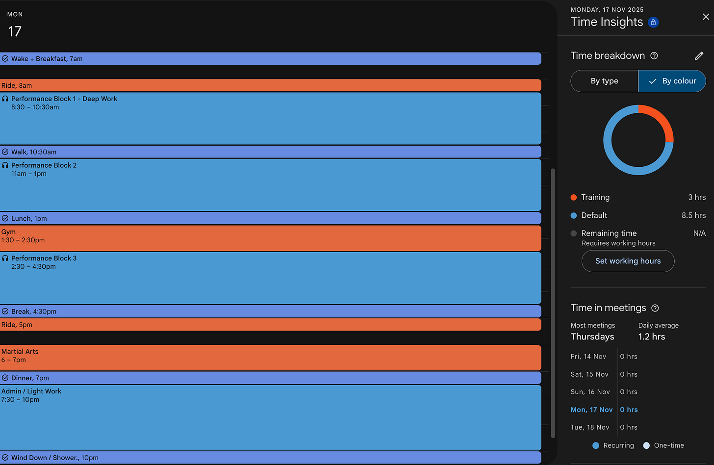 Above is an example of a ‘perfect day’ of execution for me. I use Google Calendar. I don’t fuck around with fancy tools & contraptions.