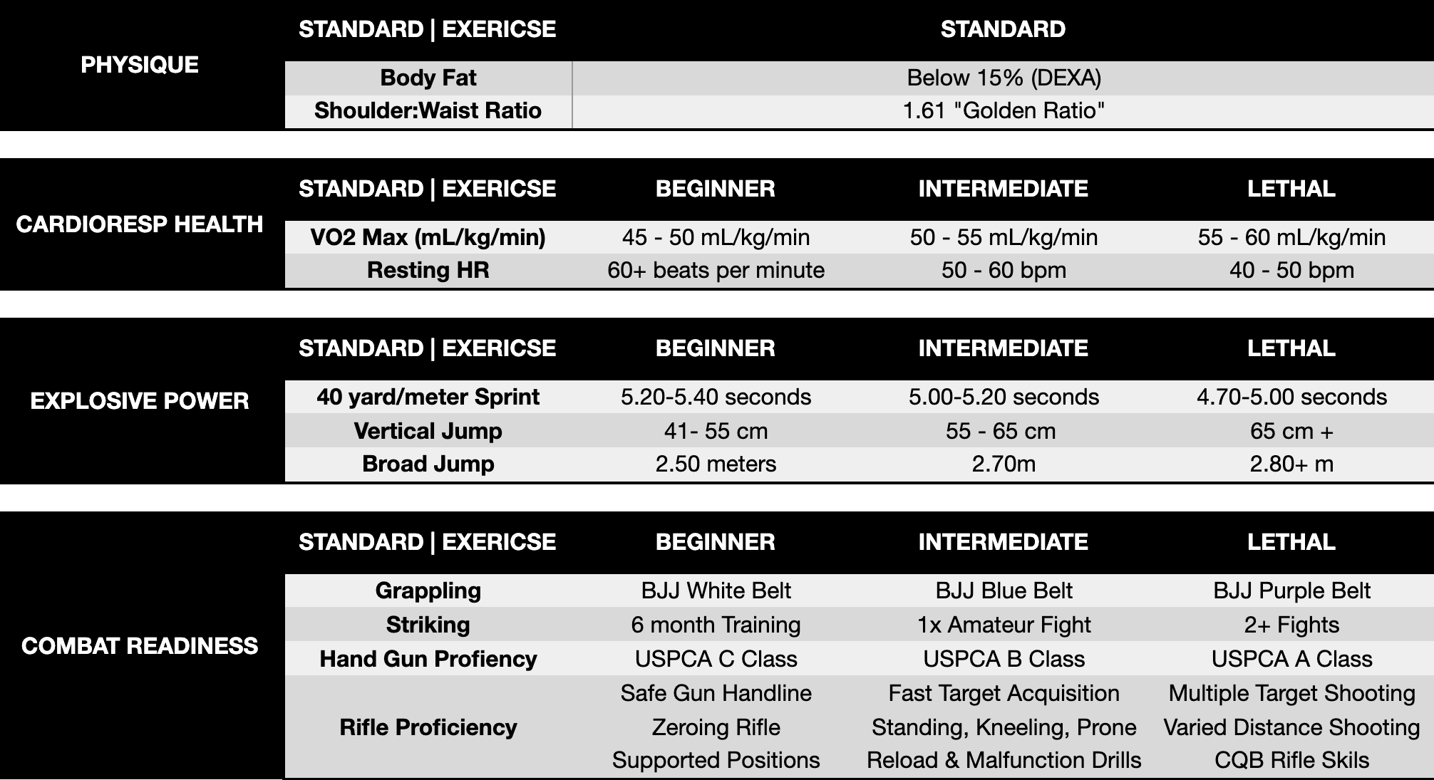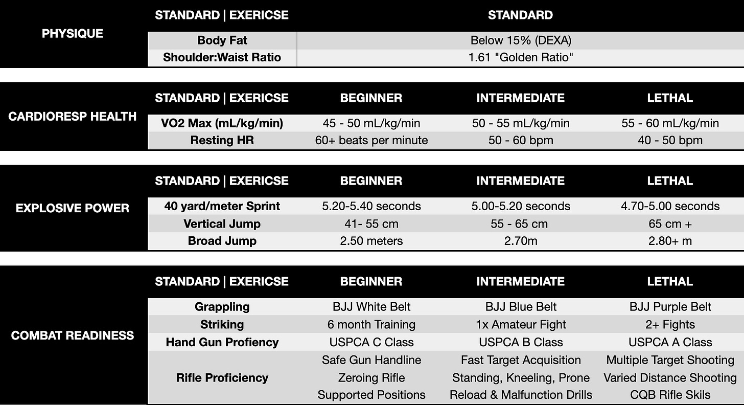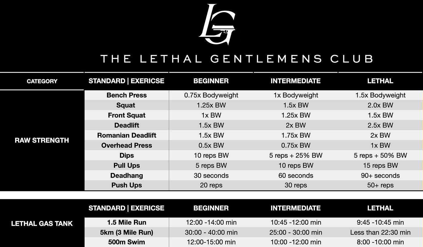 I cover a deeper dive of the Lethal Standards here, but you will notice it is a combination of strength, elite gas tank development, metabolic health, physique development, combat readiness & violent expressions of power.