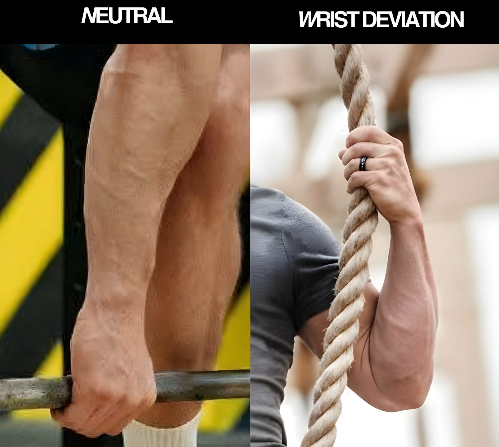 If you imagine yourself gripping a barbell & dumbbell… You will notice your wrist stays in a neutral position, straight line from knuckles to elbow.